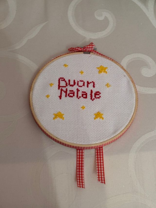 Dettagli del prodottoDelizioso telaio da ricamo a punto croce con la scritta Buon Natale e stelline gialle.