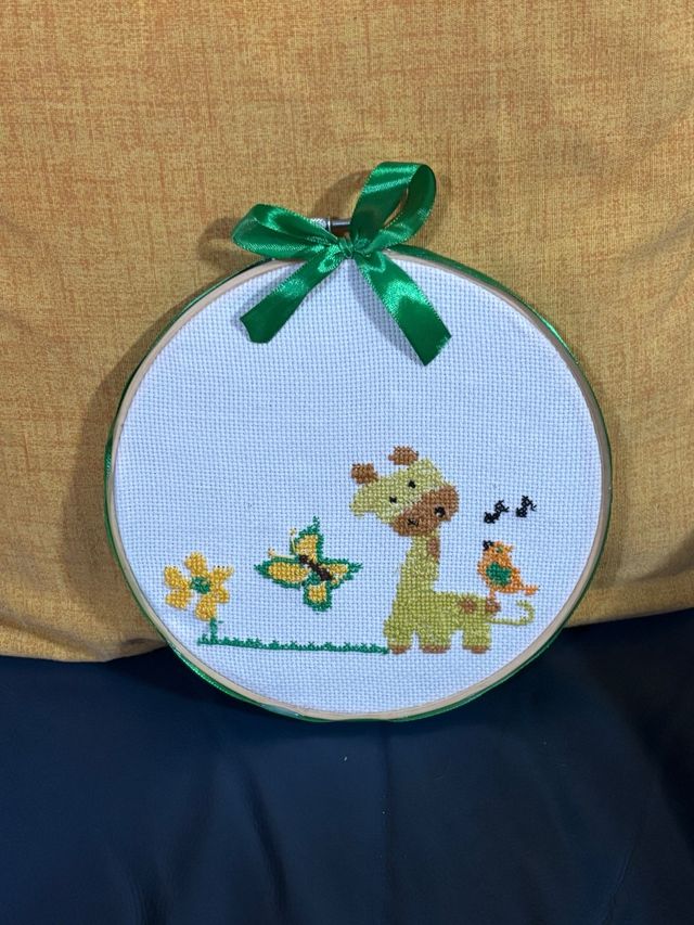 Dettagli del prodottoDelizioso telaio da ricamo con un disegno a punto croce raffigurante una giraffa, una farfalla e un fiore.
