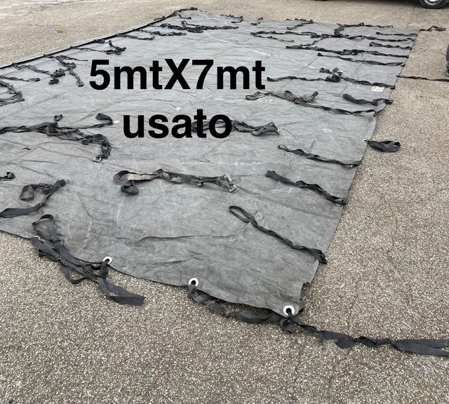Telone per copertura camion, usato, dimensioni 5mt x 7mt. - Colore grigio. - Con numerosi occhielli e cinghie di fissaggio.