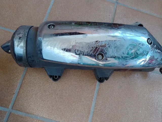Terminale marmitta di scarico per Peugeot LXR 200/SYM HD EVO 200 - Presenta un danno visibile sulla parte cromata.