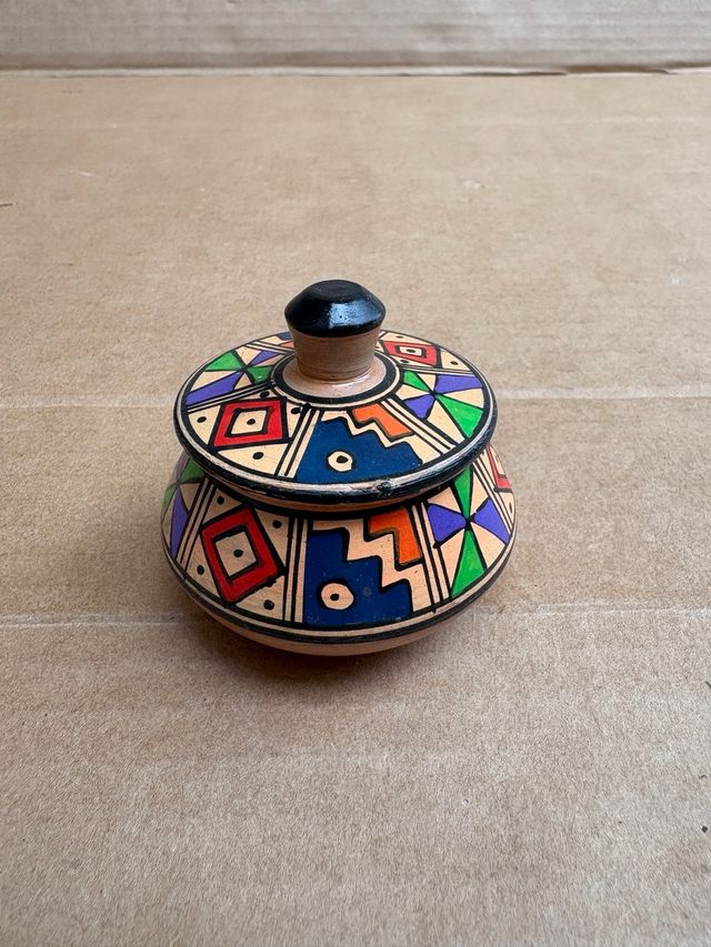 Dettagli del prodottoPiccolo contenitore in terracotta con coperchio, decorato a mano con motivi geometrici colorati.