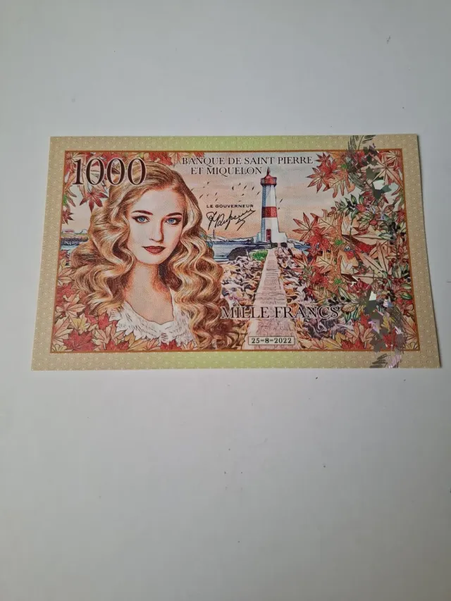 Dettagli del prodottoBella banconota da 1000 franchi del Protettorato francese di Saint Pierre e Miquelon. Timbro secco di sicurezza della Dea Medusa. Non circolante. - Design con una giovane accanto al faro. - Rappresentazione di paesaggi marini. - Data di emissione: 25-8-2022. La descrizione è stata tradotta automaticamente.
