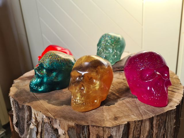Teschi in resina fatti a mano. Il teschio verde chiaro ha una base in legno e luci LED all'interno. Possibilità di essere venduti anche singolarmente. Chiedere in privato