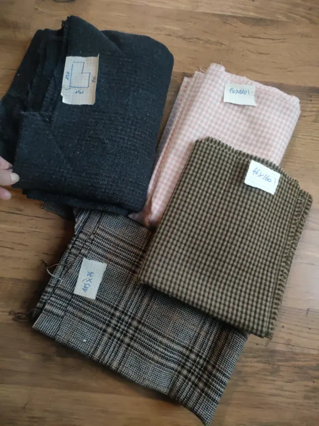 Dettagli del prodottoLotti di tessuti in lana con diverse fantasie. Tessuto scuro blu grigio media pesantezza, per giacche, altri adatti a sciarpe, gonne pantaloni.