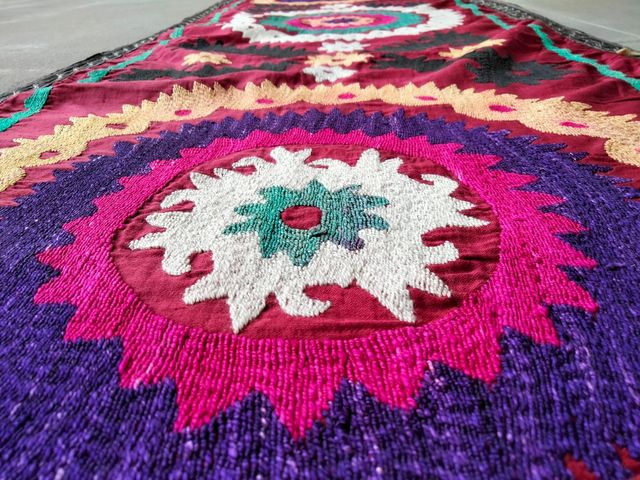 Dettagli del prodottoVendo questo bel tessuto di Suzani a prezzo di occasione per cambio arredo! Annodato a mano dalle popolazioni dell'Uzbekistan. Creato per le doti delle spose. Questo Suzani presenta ancora i ganci che gli hanno permesso di essere appeso all'interno delle dimore tipiche, chiamate yurte (tende dalla forma circolare) per addobbarne le pareti, seguendone appunto la forma curva. Ecco spiegato il perché della sua inusuale lunghezza!