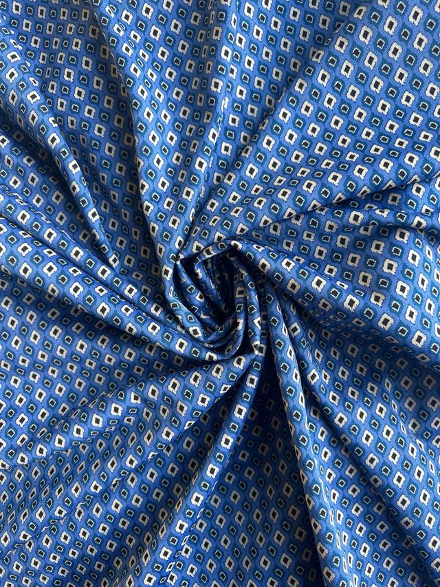 Tessuto in jersey punto Milano con una fantasia geometrica. - Fantasia con rombi bianchi e neri su sfondo blu. - Tessuto jersey punto Milano.