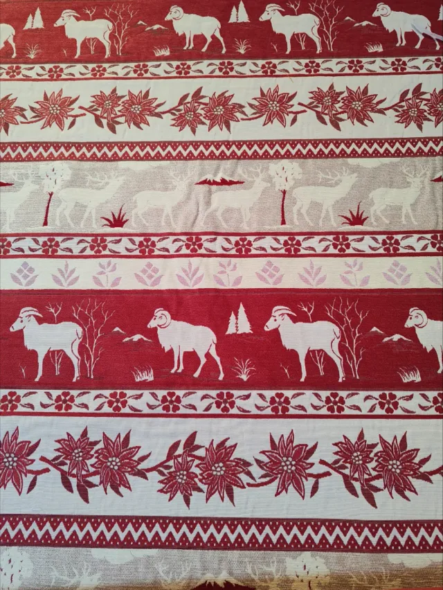 Dettagli del prodottoTessuto tipo goblain con un design ispirato alla montagna, caratterizzato da una fantasia di stambecchi.