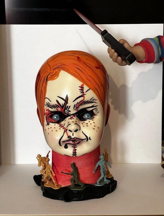 Dettagli del prodottoBellissima testa di bambola Chucky, ispirata al film horror. Un pezzo unico per collezionisti! - Realizzata con cura nei dettagli. - Perfetta per arredare la tua casa in stile horror. - Include 5 soldatini giocattolo.