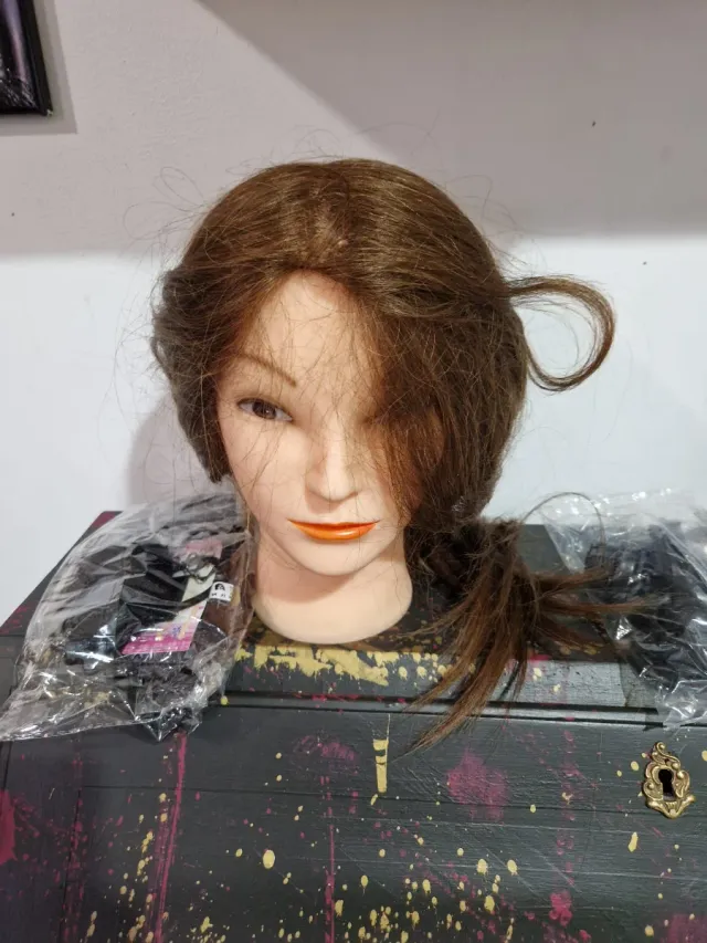 Dettagli del prodottoTesta professionale per parrucchiere con capelli castani lunghi. Ideale per esercitarsi con acconciature e tagli.