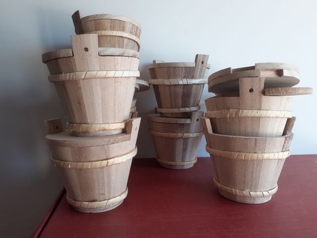Piccoli tinelli in legno con buchi per appendere Con coperchio Sono 11 pezzi Misura in foto