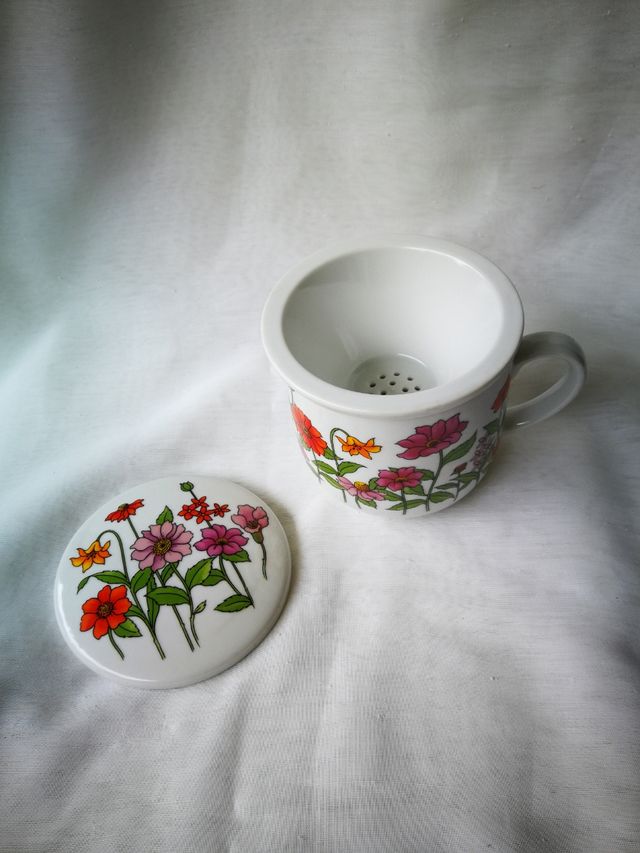 Tazza mug tisaniera con filtro in ceramica e decori floreali