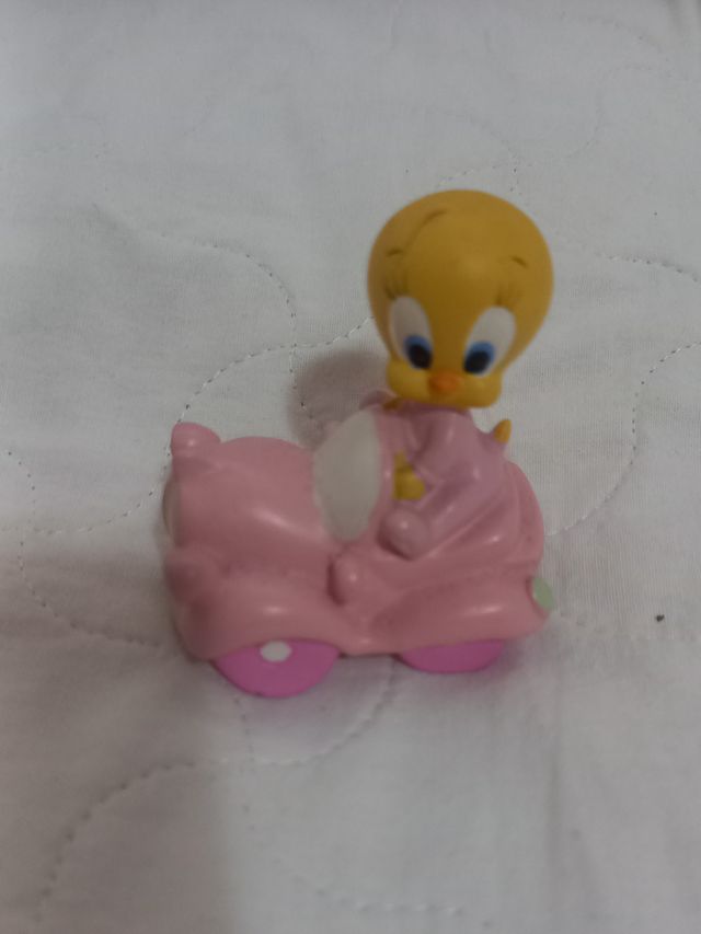 Personaggio di Titti seduto su una macchinina rosa. - Dettagli del personaggio Titti. - Veicolo a forma di macchinina. - Colore principale rosa.