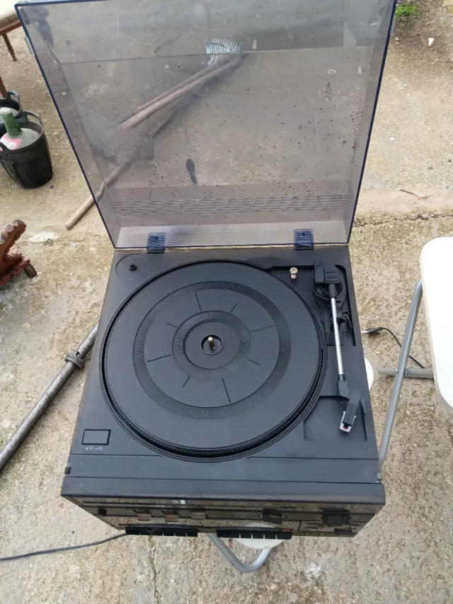 Dettagli del prodottoGiradischi vintage in nero. Un classico per goderti la tua musica. - Disco giradischi. - Braccio con ago. - Copertura protettiva trasparente. La descrizione è stata tradotta automaticamente.