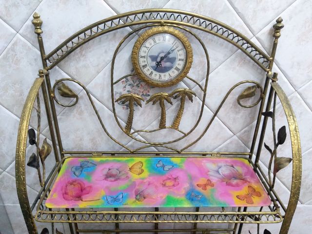 Dettagli del prodottoin ferro battuto con ripiani in vetro decorati con delicati disegni in decoupage