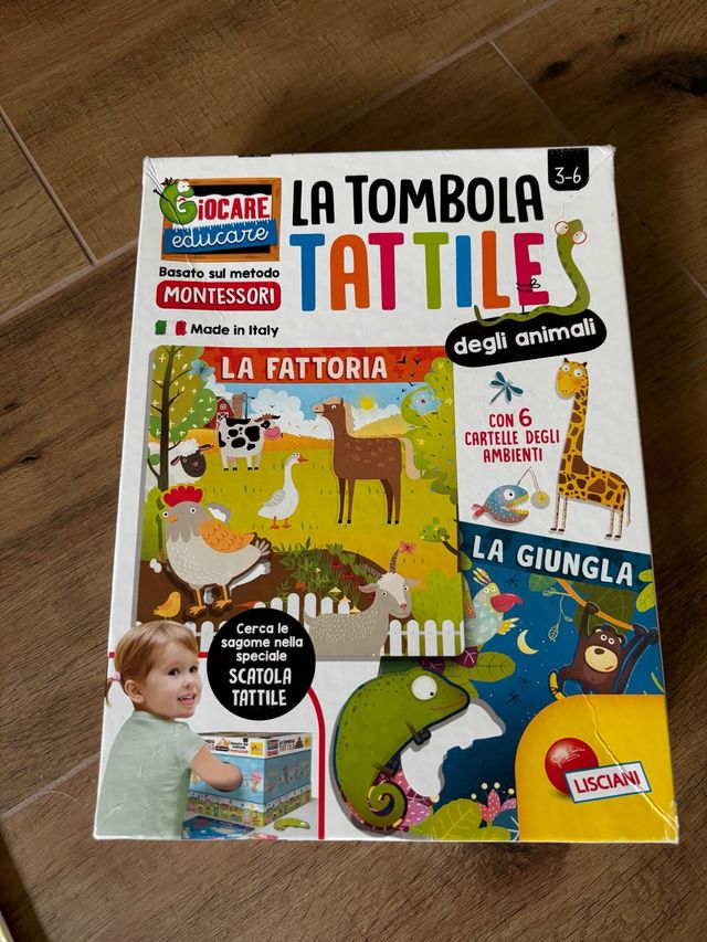 Dettagli del prodottoGioco educativo La Tombola Tattile di Lisciani, basato sul metodo Montessori. Include due ambienti: La Fattoria e La Giungla.