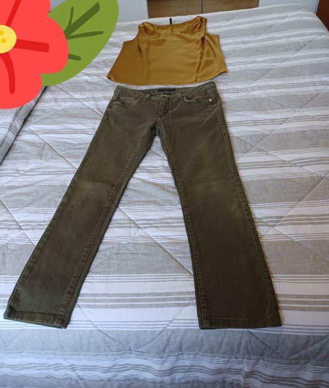 Top giallo senape e jeans verde oliva