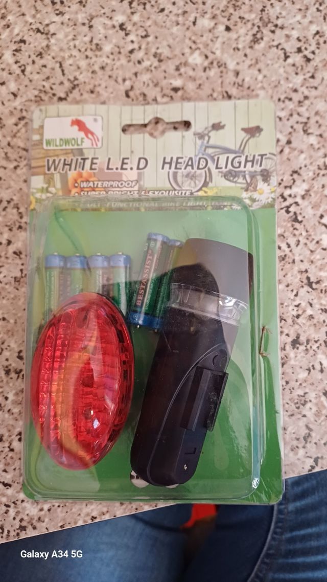 torcia a led, ancora confezionata,con batterie e luce per bicicletta