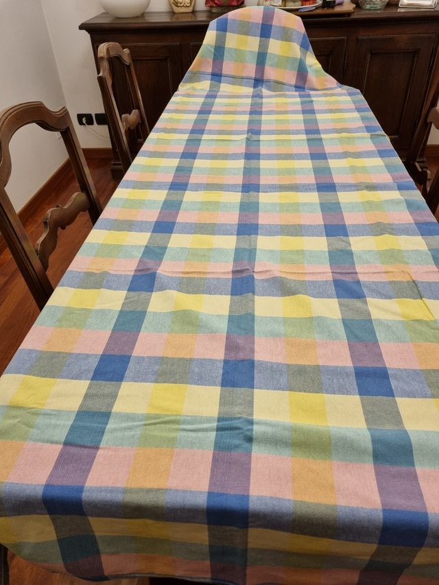 Dettagli del prodottoTovaglia molto grande a quadri giallo azzurro e rosa con 12 tovaglioli.