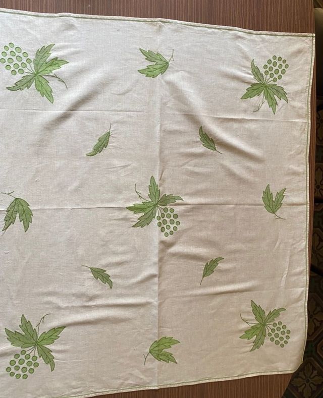 Dettagli del prodottoTovaglia ricamata a mano (punto sfilza, erba, quadro) in verde su tessuto di lino grezzo Vintage colore ecrù.