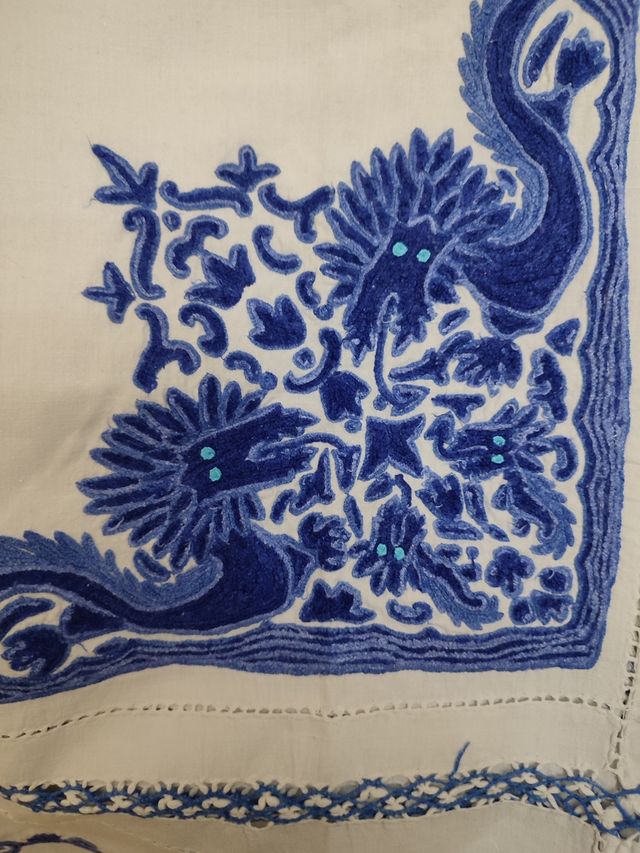 Bellissima tovaglia rettangolare per 12 bianca con ricami blé senza tovaglioli