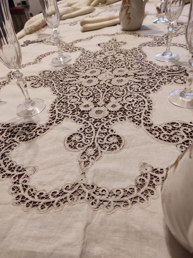 Dettagli del prodottoVendo questa stupenda tovaglia ovale realizzata su tessuto di puro lino di altri tempi corposo e leggero ,pizzo di Cantù e cuciture rigorosamente fatti a mano colore beige chiaro misure larghezza 240 cm lunghezza 265 cm completa di 12 tovaglioli, per le sue dimensioni può essere usata anche come copriletto, priva di qualsiasi difetto non macchie non aloni ne strappi è buchi, proviene da un corredo di famiglia, vintage,