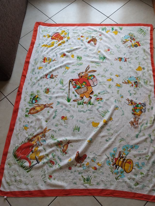 Tovaglia Pasqua con conigli e decorazioni varie dimensione 146 x 110 cm 100% cotone