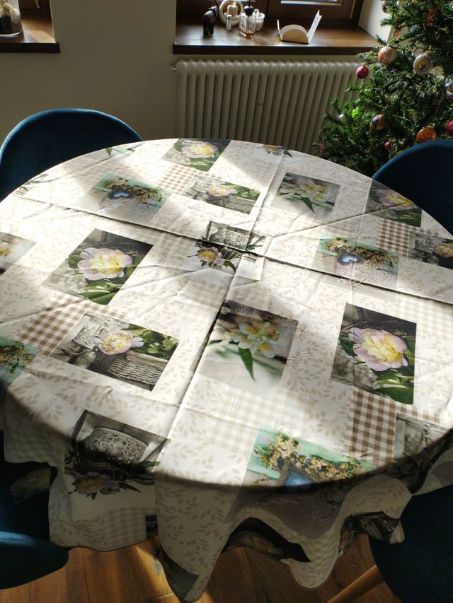 Tovaglia rotonda idrorepellente, nuova, mai usata. Ideale per tavolo rotondo di diametro 110-120