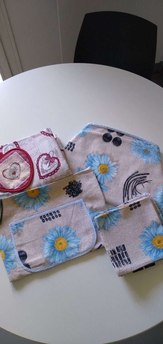 Dettagli del prodottoTovaglie da tavola rotonde 100% cotone made in Italy. La tovaglia a fantasia su fondo colore sabbia con grandi fiori azzurri e gialli e liquirizie è completa di otto tovaglioli ed un grembiule coordinato; la tovaglia con i cuori su fondo beige/grigio (tirolese) è priva di tovaglioli ma viene fornita con una presina coordinata. Entrambe sono in 100% cotone e made in Italy e non sono state mai usate (solo tolte dalle confezioni originali, lavate, stirate e riposte.)
