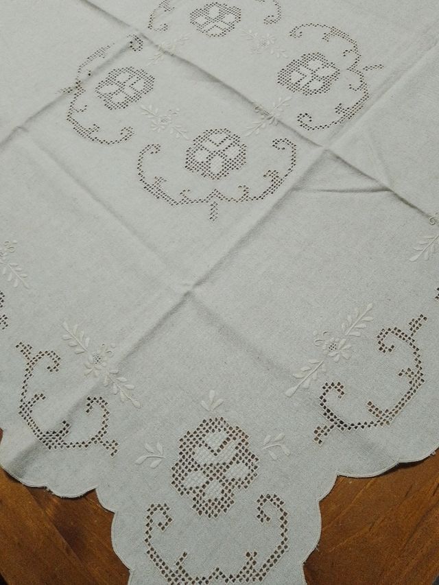 tovaglietta o centrotavola beige lino sfilato siciliano e ricamo tutto lavorata a mano mai usata cm85x85