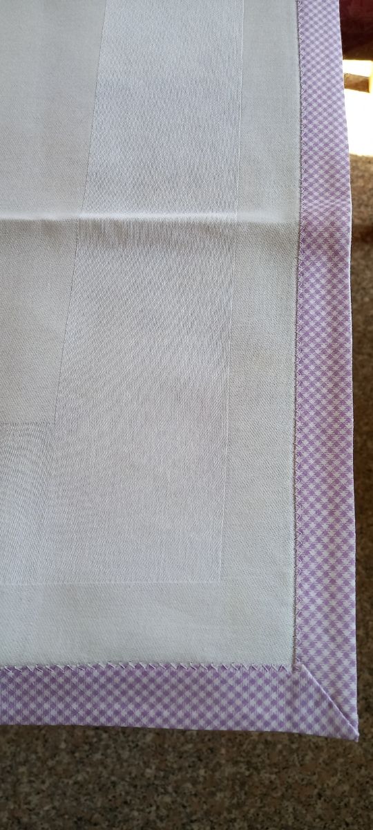 deliziosa tovaglietta in cotone bianco con bordino lilla di 98x92 cm, ideale per la colazione o per un tavolinetto piccolo. Fatta a mano.