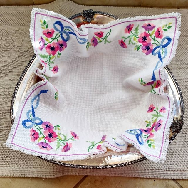 Dettagli del prodottoTovaglietta ricamata a punto croce con ricami floreali sui 4 lati. Dimensioni 35 x 35 cm. prodotto artigianale, Handmade, fatto a mano Misure del prodotto