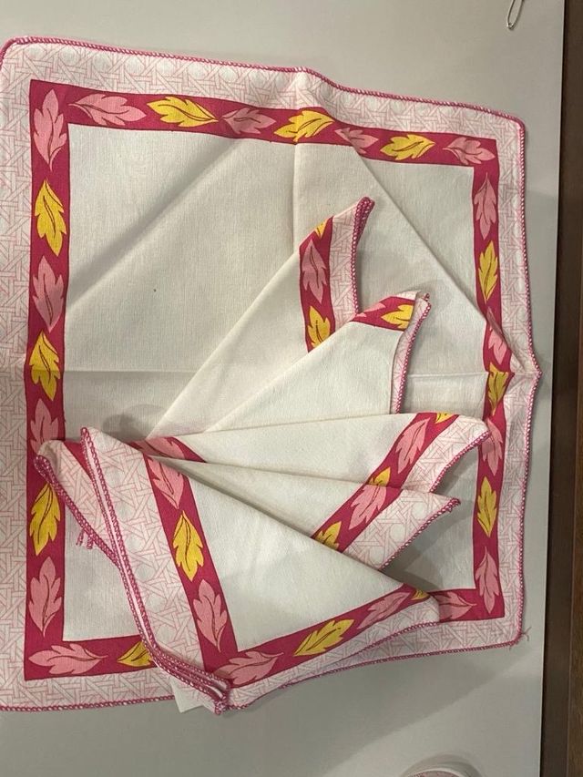 Vendo Tovaglioli in cotone, 6 tovaglioli in cotone colore bianco con stampa sul bordo colore rosa con foglie gialle e rosa. In ottime condizioni.