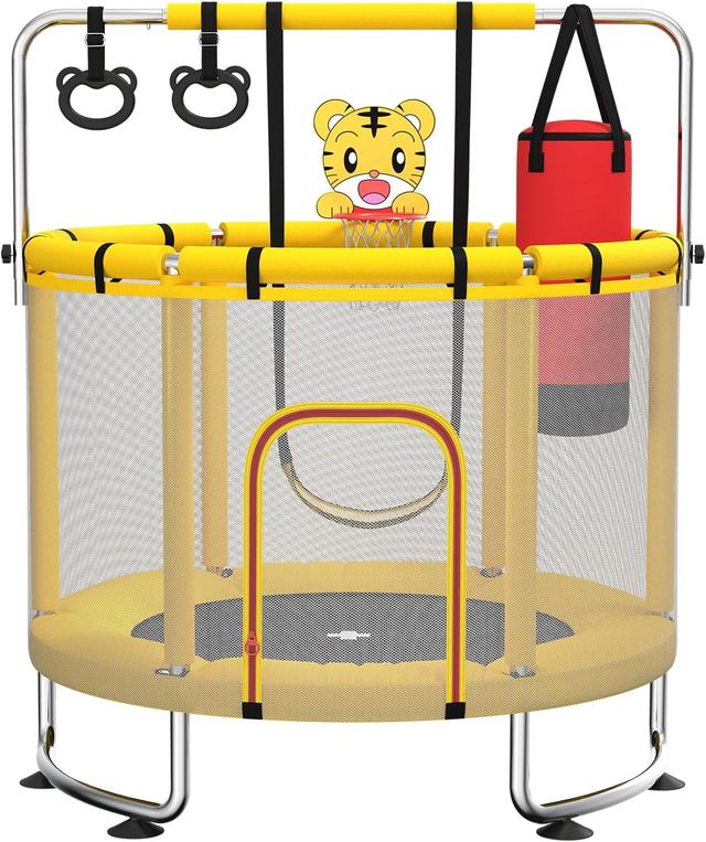 Dettagli del prodottoTrampolino per bambini da 140 cm per interni/esterni, capacità di carico 50 kg, con rete di sicurezza, barra da ginnastica regolabile e canestro da basket, regalo per bambini e bambine