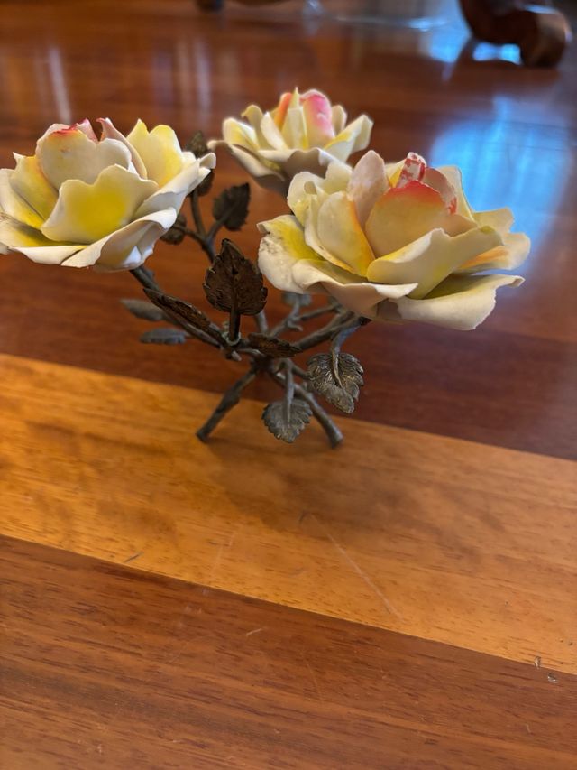 Dettagli del prodottoDelicato set di tre rose in porcellana Capodimonte con dettagli in ferro battuto.