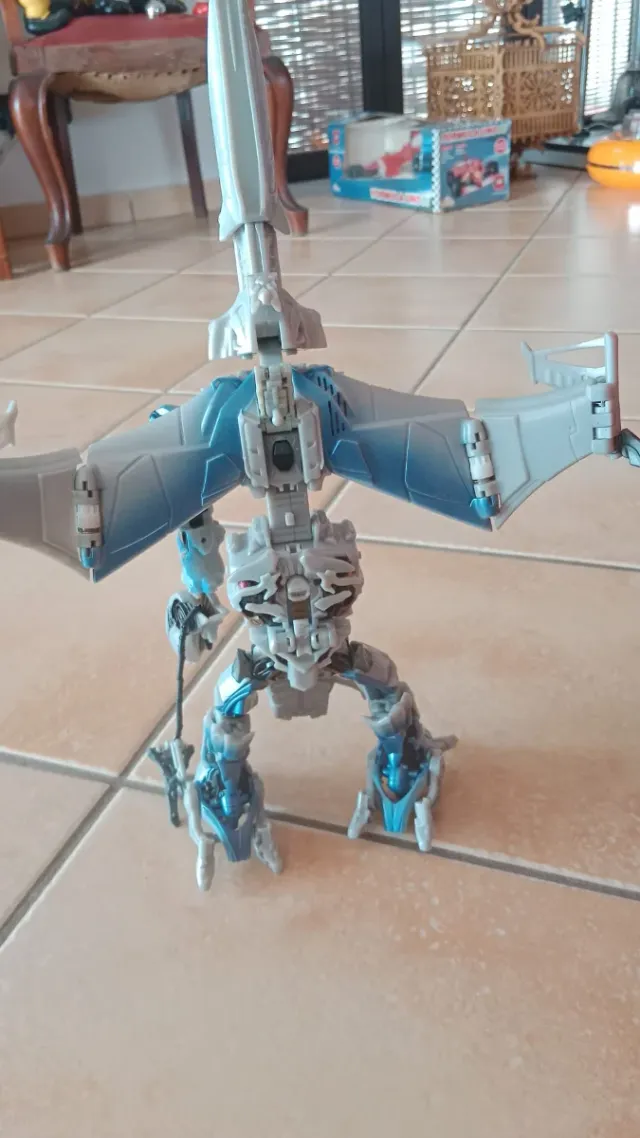 Action figure del personaggio di Megatron della serie Transformers. Dettagli in grigio e blu.