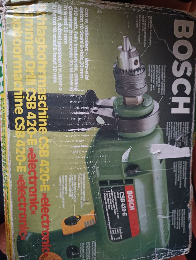 Trapano a percussione marca Bosch, la scatola è un po' rovinata,ma il trapano è nuovo praticamente, usato forse per fare una decina di fori.