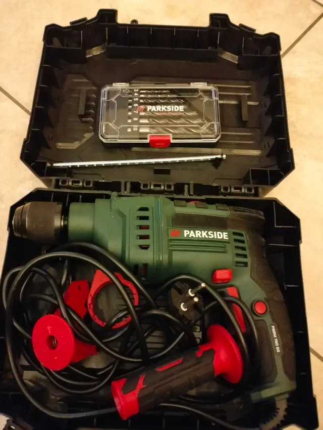 Dettagli del prodottoTrapano a percussione Parkside completo di valigetta e accessori.