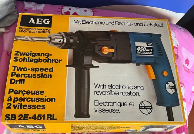 Trapano a percussione a 2 velocità AEG. - Modello: SB 2E-451 RL - Potenza: 450 Watt - Funzione elettronica e rotazione reversibile - Colore: blu e nero