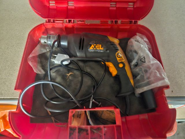 Trapano elettrico Axel completo di valigetta rossa. - Colore nero e giallo. - Impugnatura supplementare inclusa.