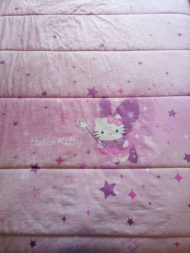 Dettagli del prodottoTrapunta singola Hello Kitty sui toni del rosa e del viola. Interno color beige chiaro. Imbottitura uniforme e cuciture integre. Acquistata alla Gabel. Misure 160 x 250. Imbottitura in poliestere e fodera in cotone 100 %. Usata ma in buone condizioni e ben tenuta. Vendo già lavata in tintoria.