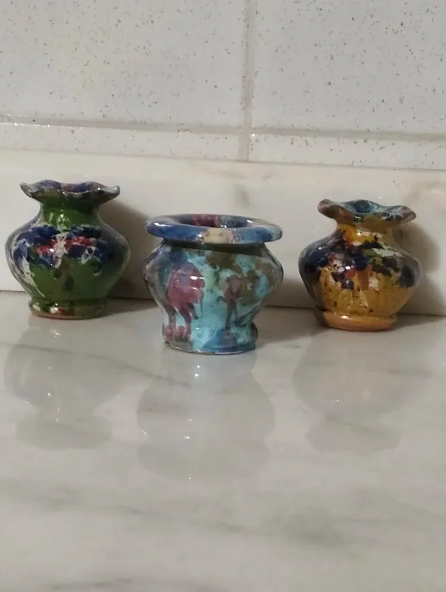 Dettagli del prodottoSet di tre piccole anfore decorative di manifattura artigianale con un design unico e colorato.
