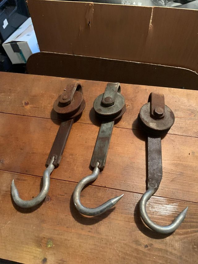 Tre carrucole con gancio 10 euro al pezzo.