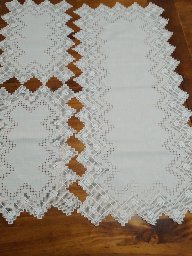 Dettagli del prodottotre centri sfilato Panetta a mano bianchi lo sfilato siciliano è arricchito con orlo lavorato particolarmente nuovi misure cm84x39 il grande i due piccoli cm43x29/43x29