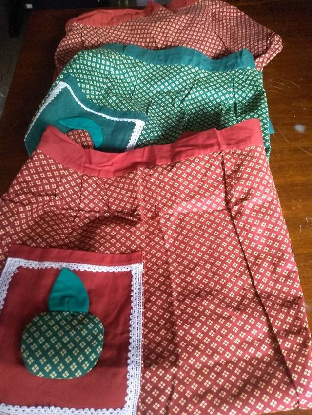 Dettagli del prodottoTre grembiuli colorati da cucina, con una tasca. 100% cotone.
