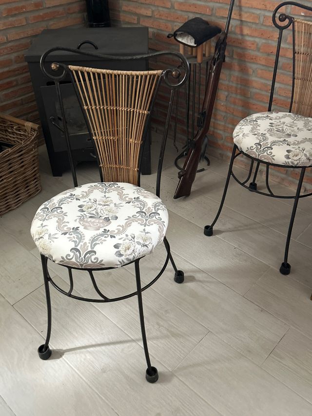 Tre sedie in ferro battuto e midollino con seduta imbottita