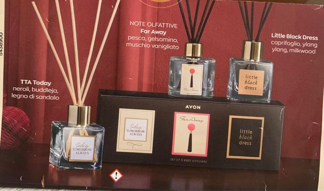 Tre diffusori x ambiente a bastoncino. In tre differenti profumazioni: Little black dress, Today e Far Away. Da 50 ml l’uno. In confezione regalo. Avon
