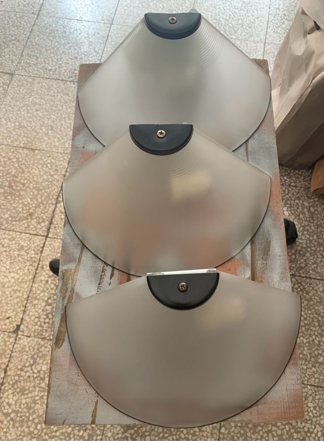 Tris di applique, vetro satinato con bordino nero, completi di portalampada, in buono stato d’uso