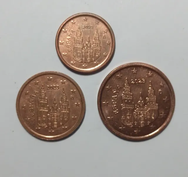 Set di tre monete da 1, 2 e 5 centesimi di Euro. - Anno di conio: 2023. - Paese: Spagna. - Dritto: raffigurante la Cattedrale di Santiago de Compostela.