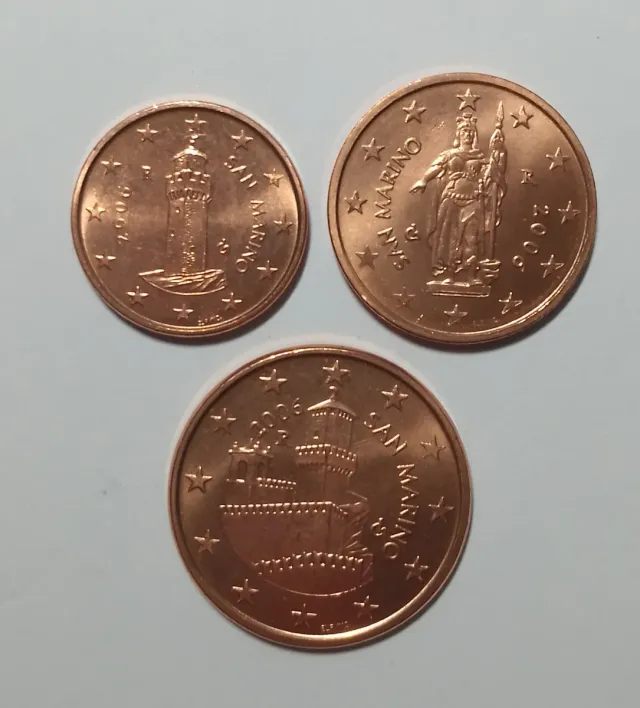 Dettagli del prodottoSet di tre monete da 1, 2 e 5 centesimi di Euro, coniate a San Marino nel 2006.