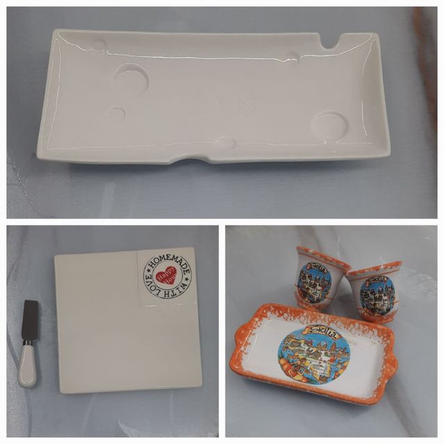 tagliere con coltellino, set da 2 tazzine e vassoietto Sicilia, piccolo vassoietto porta olive.